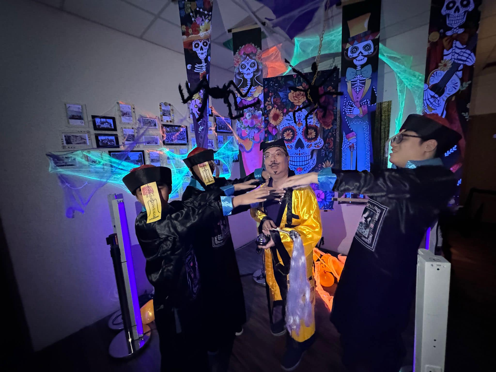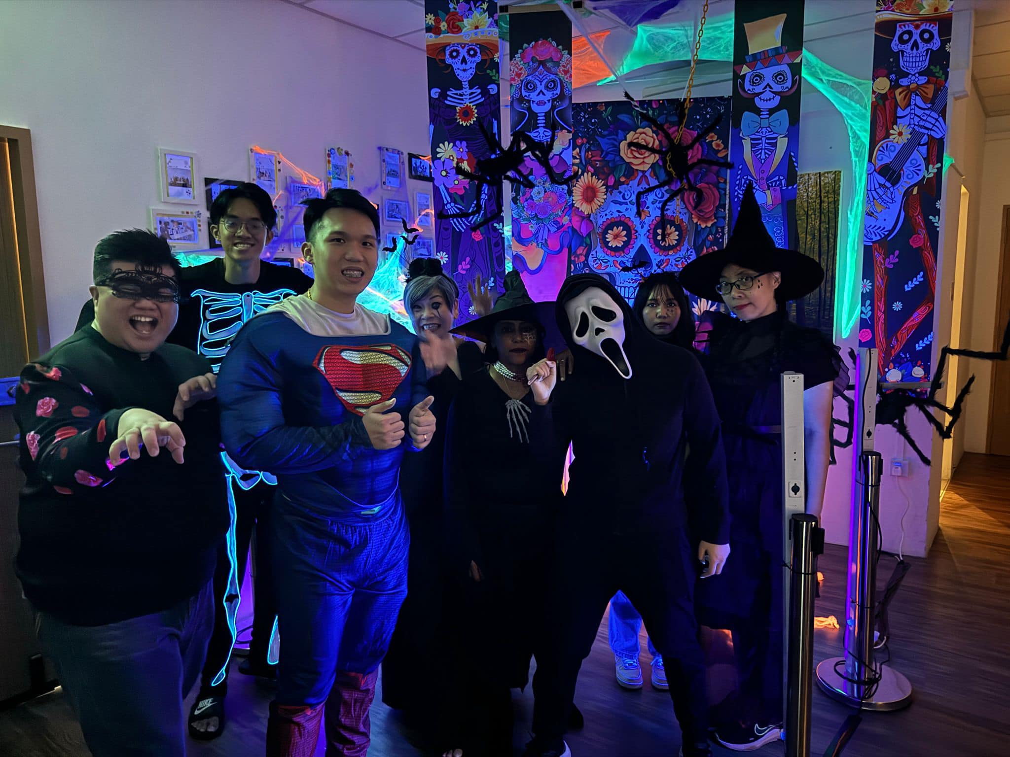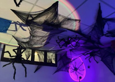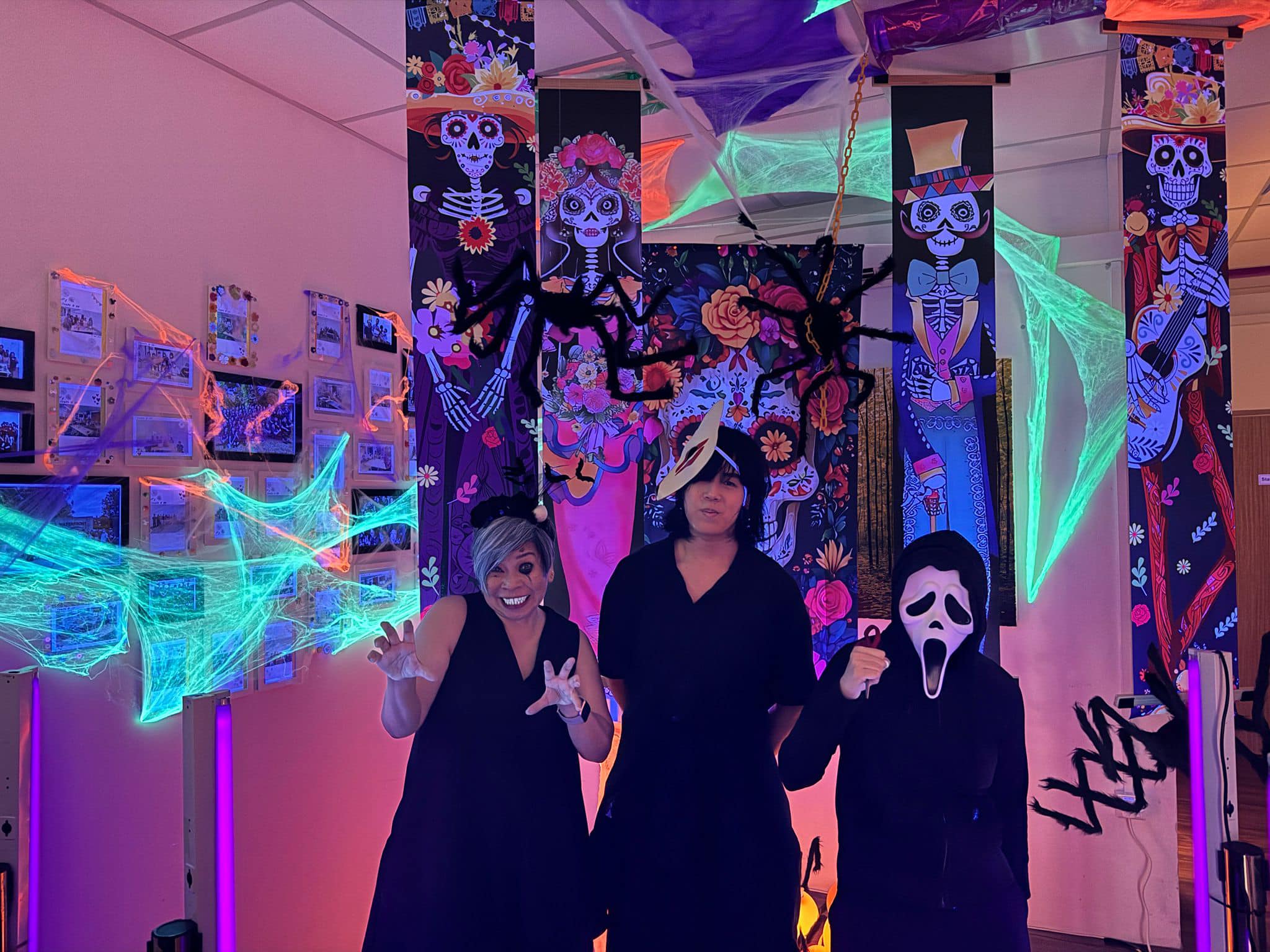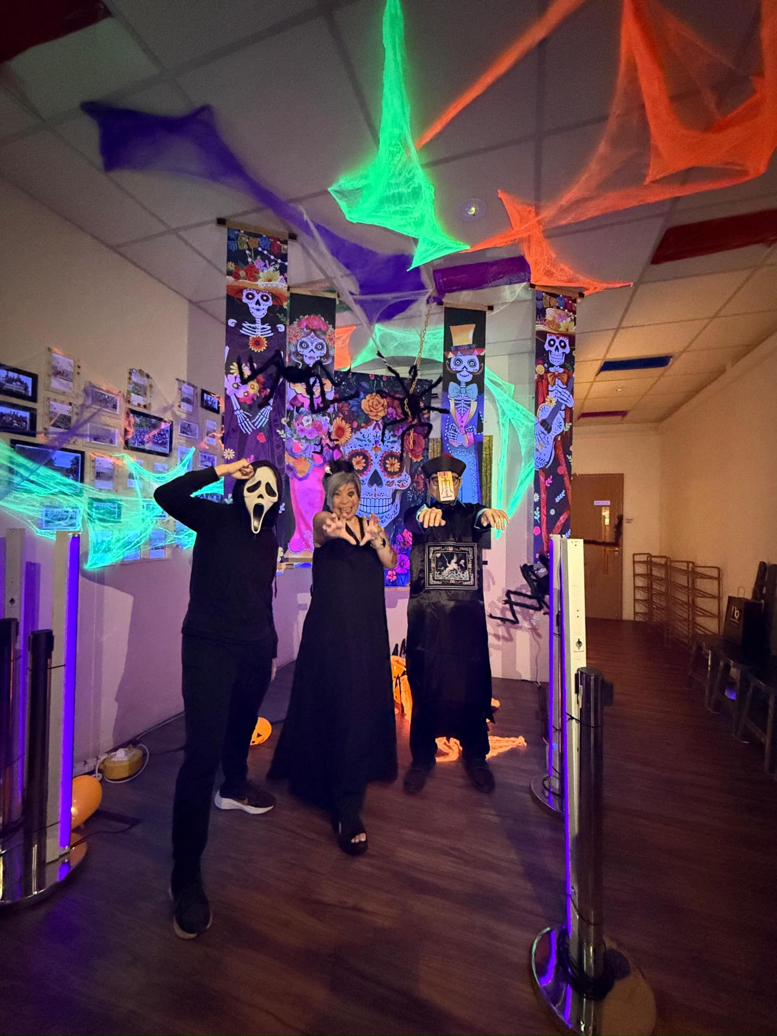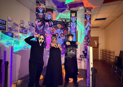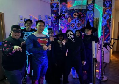 Staff and volunteers dressed as spooky movie characters, creating an eerie atmosphere with neon lights and vibrant horror-themed decorations. The use of dry ice created a haunting fog, while the faint scent of rose water added a sweet yet unsettling touch, heightening the spooky ambiance.