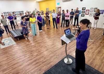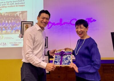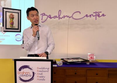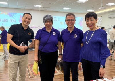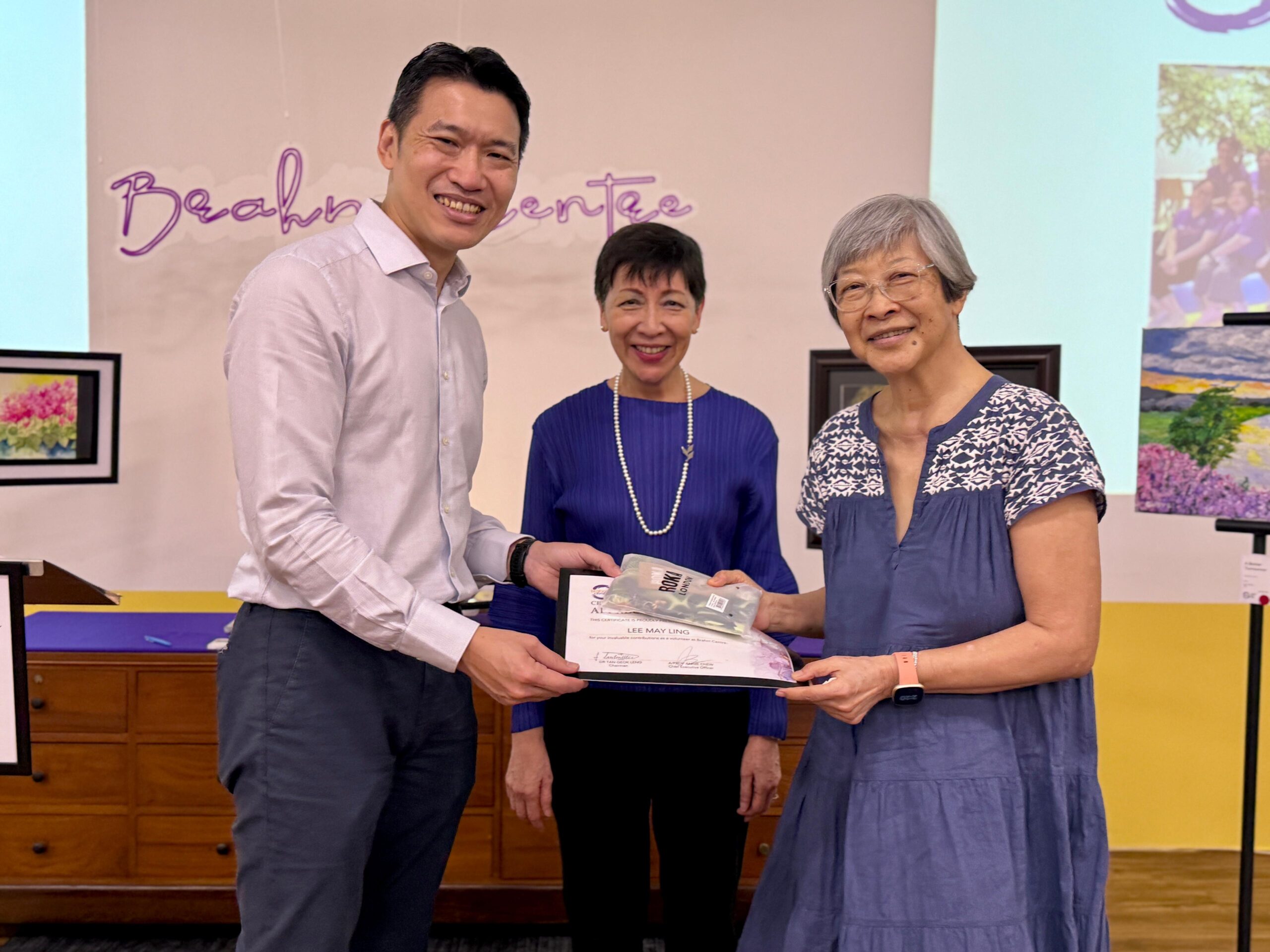 At the opening ceremony of the art exhibition, Minister Neo also presented a certificate of appreciation to volunteer, Lo May Ling (78 years old), to recognize her contribution to Brahm Center.