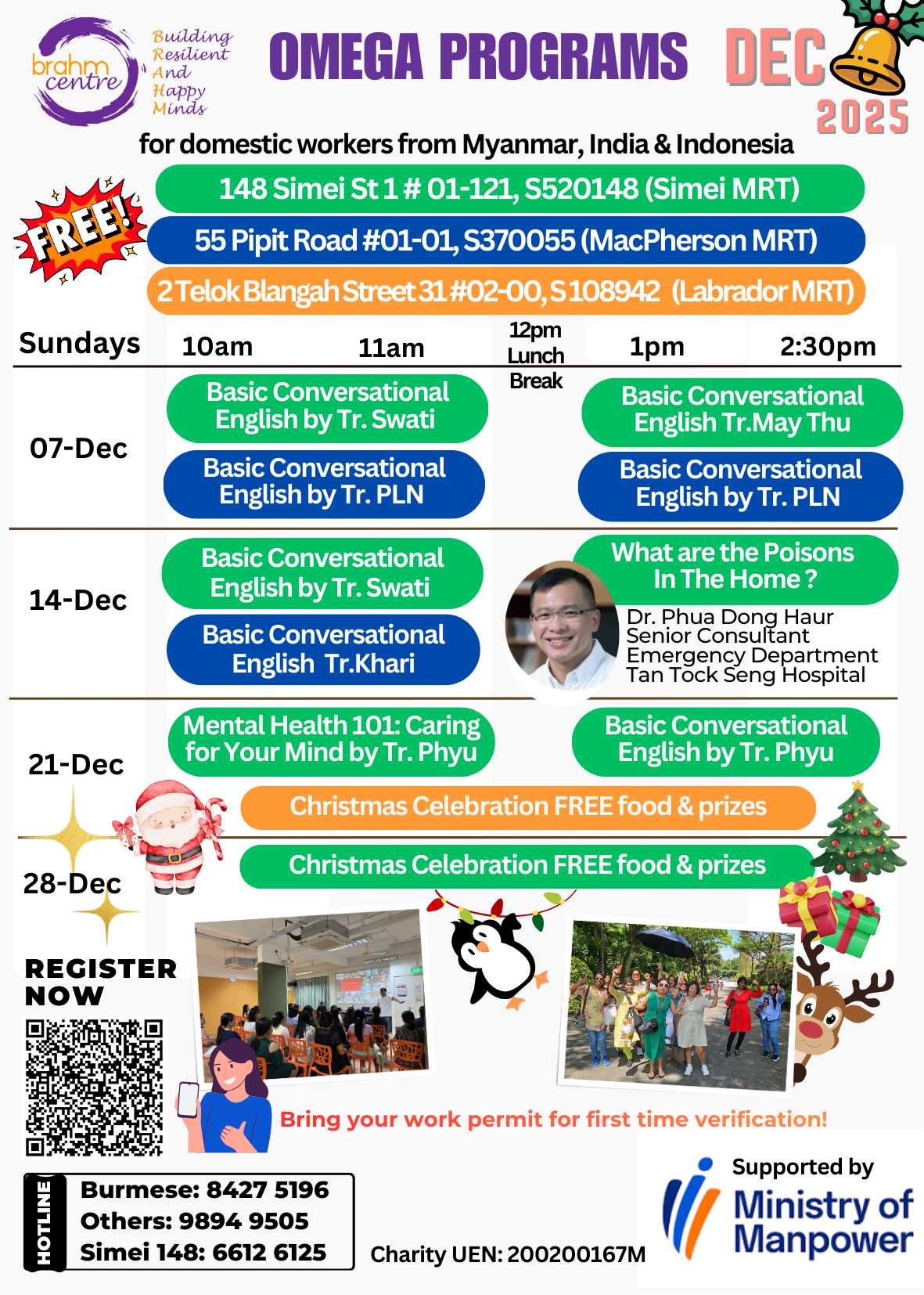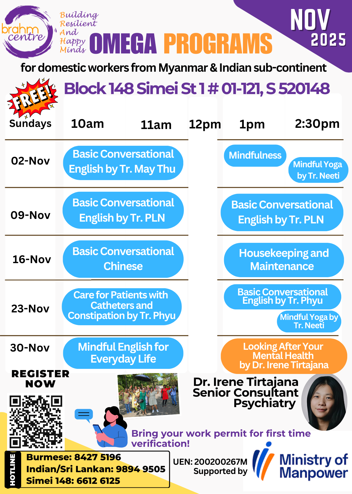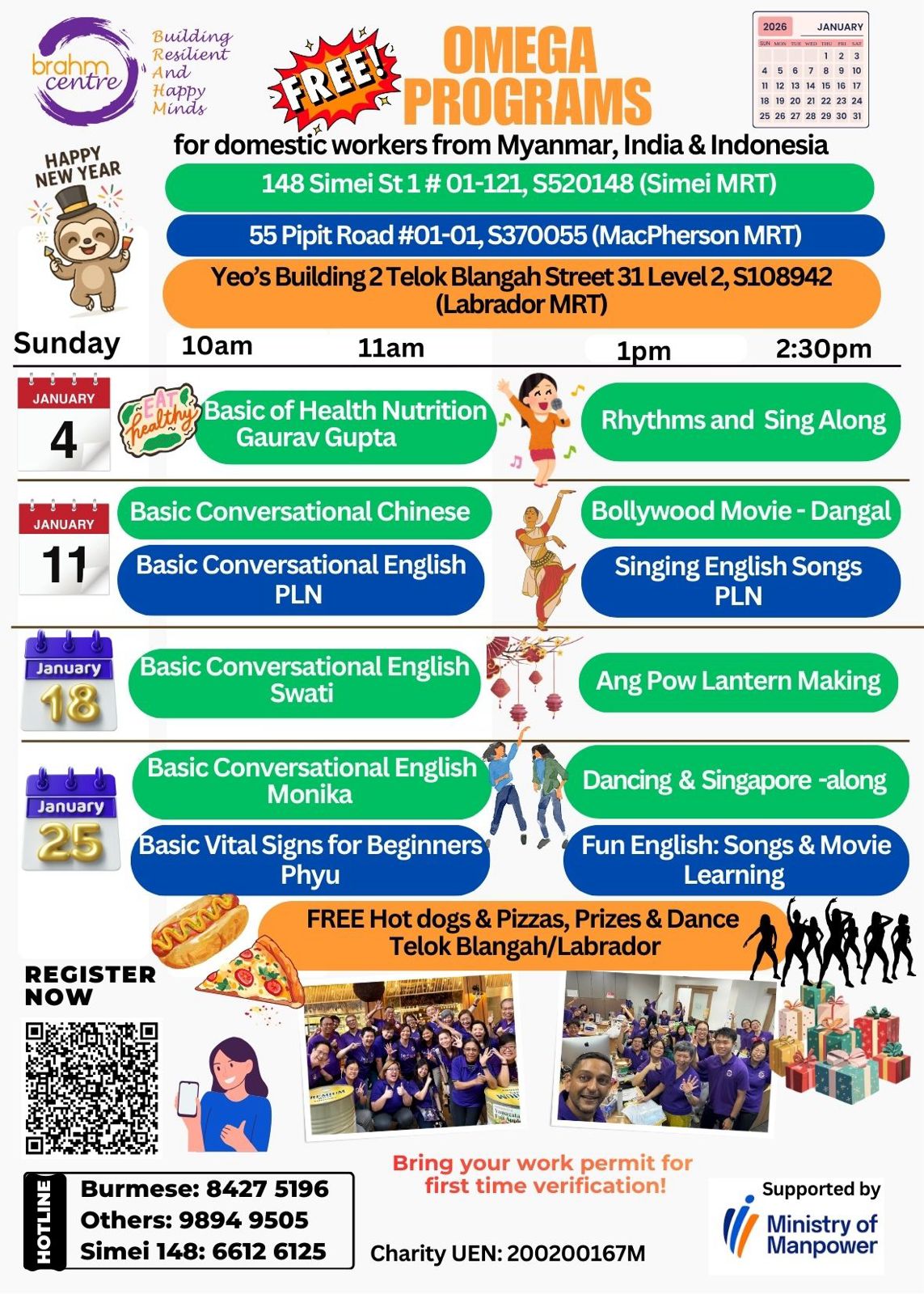 At Brahm Centre, we understand the invaluable role Migrant Domestic Workers (MDWs) play as primary caregivers within our community, especially as our population ages. We believe in fostering healthy relationships between employers and MDWs, which is why we have introduced the OMEGA (Oasis for Mindful Enrichment, Growth, and Advancement) program. This program is designed to empower MDWs in Singapore by enhancing their skills and overall welfare, enabling them to better assimilate into Singaporean culture and build a stronger support network. Initially focused on Burmese- and Indian-speaking MDWs, we aim to extend this initiative to other groups of MDWs in the future.